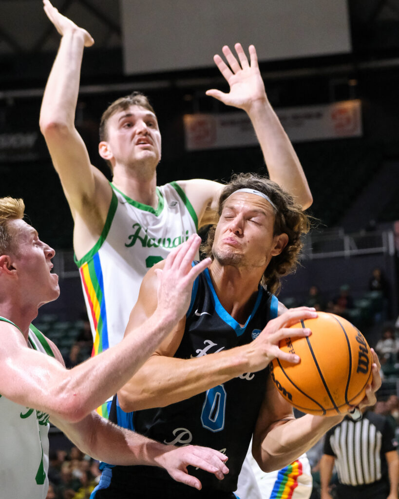 Hawai’i grad transfer center Isaac “Big Fish” Johnson (top) was 10-for-10 from the free throw line in Monday’s 88-76 victory over Hawai’i Pacific. (Brandon Flores Photography)