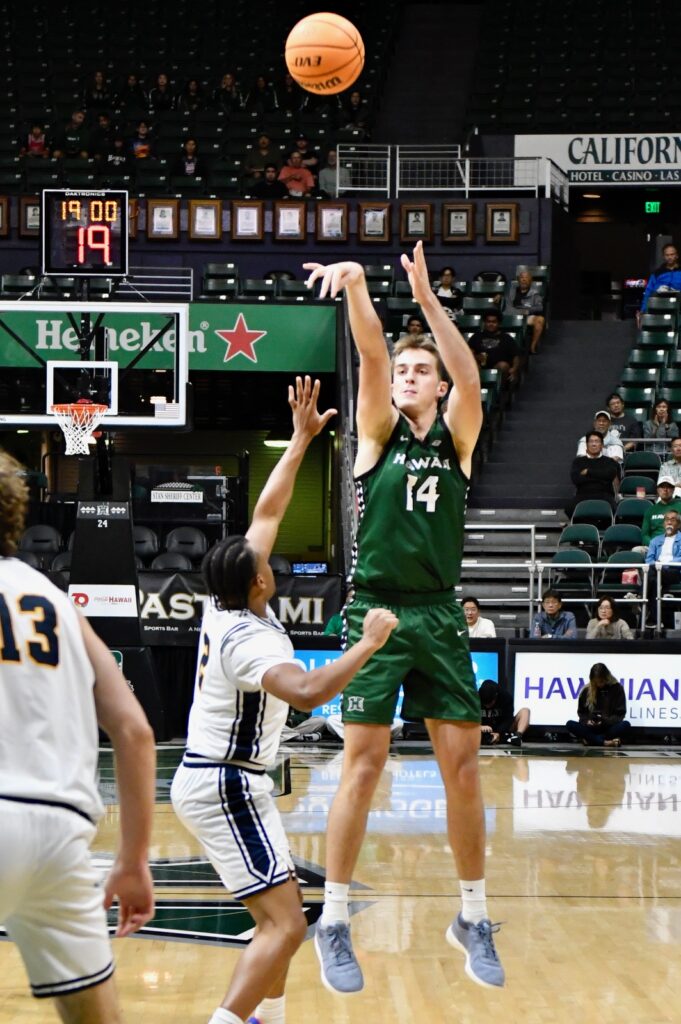Hawai’i senior forward Harry Rouhliadeff, shown in a home game earlier this season, scored a team-high 16 points and grabbed four rebounds Saturday night in an 83-73 loss at UC San Diego. (Chris Kadooka file photo)
