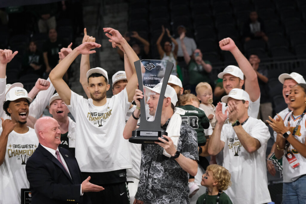Hawai’i head coach Eran Ganot hoists the Big West Conference Championship trophy after receiving it from league commissioner Dan Butterly as the team celebrates its 71-64 victory over UC Irvine at the Lee Family Forum in Henderson, Nev. (Brandon Flores Photography)
